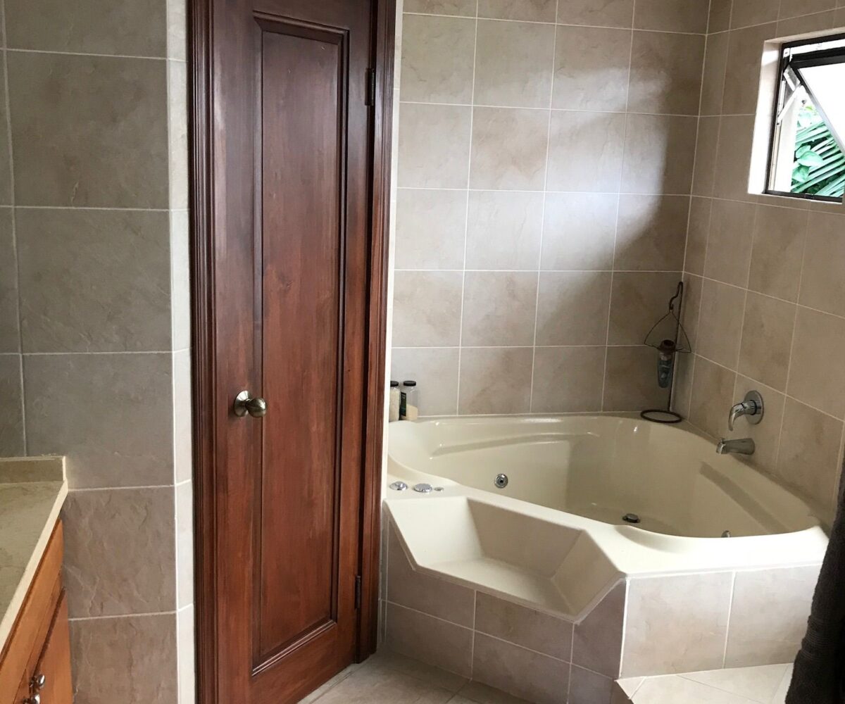 - Master bathroom with jacuzzi, shower and toilet, two sinks and quartz countertops
