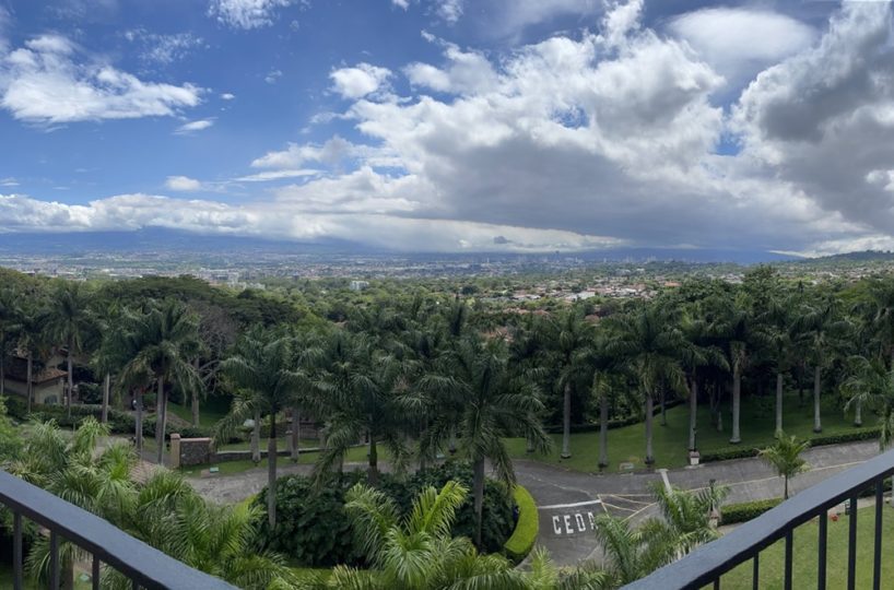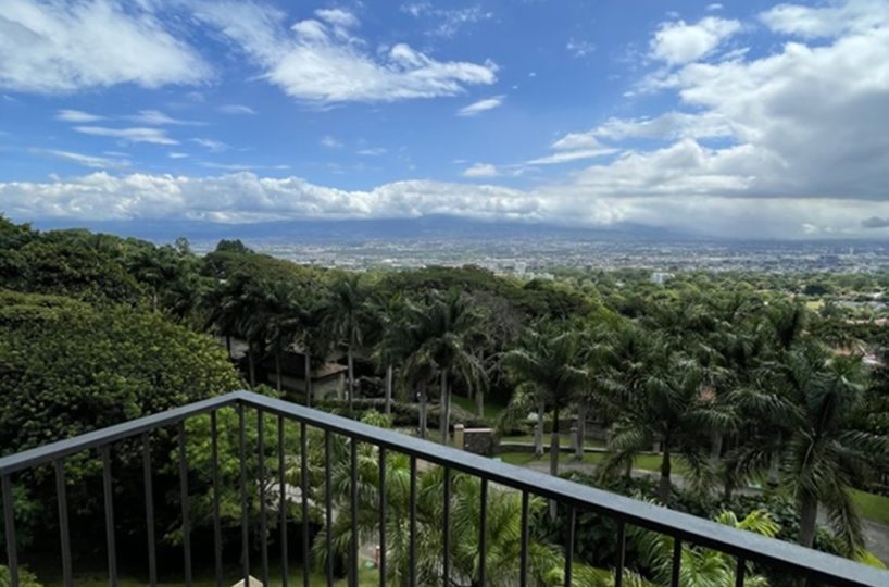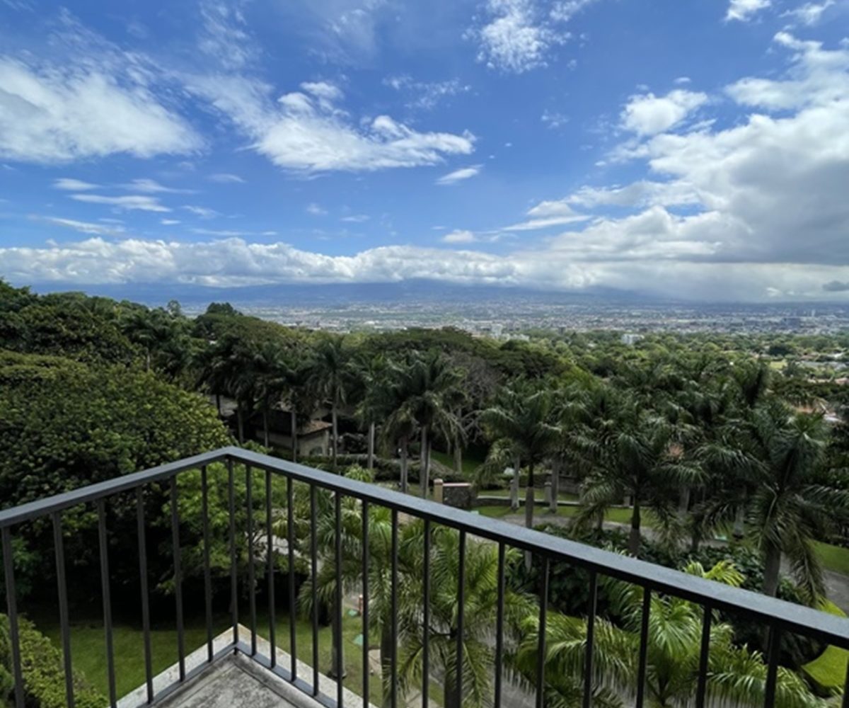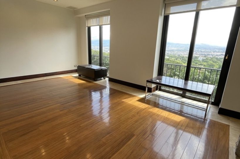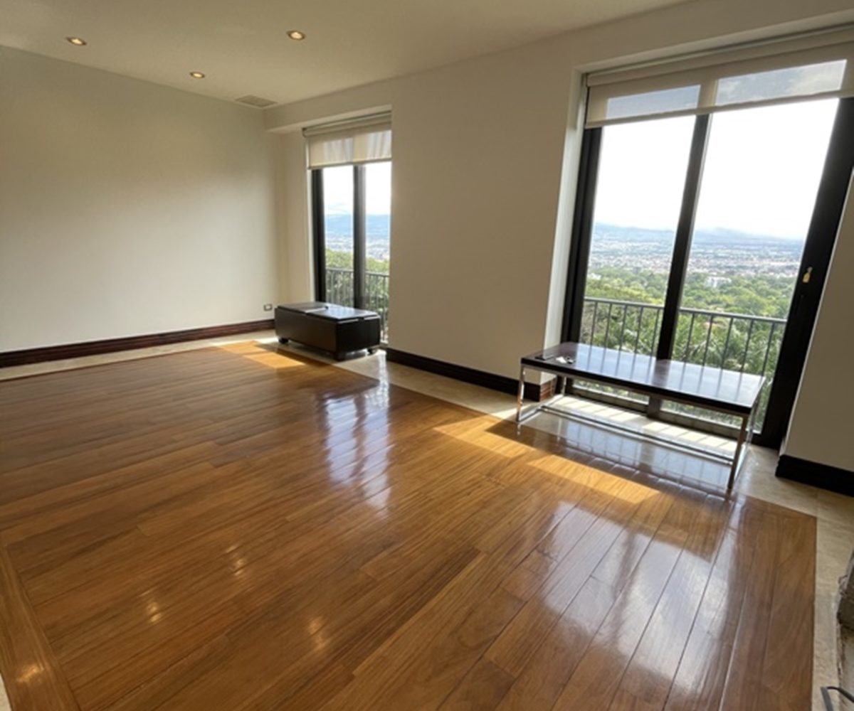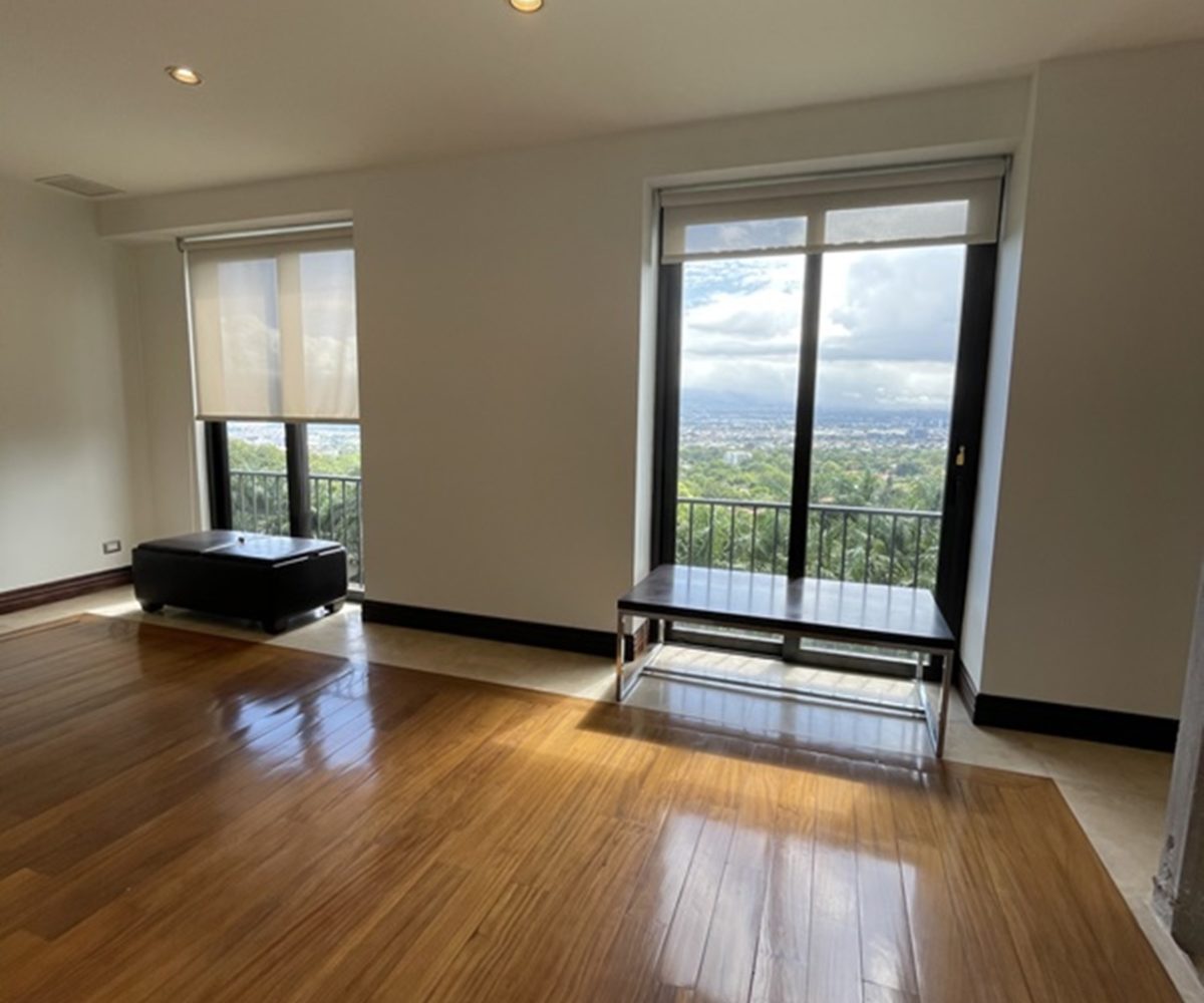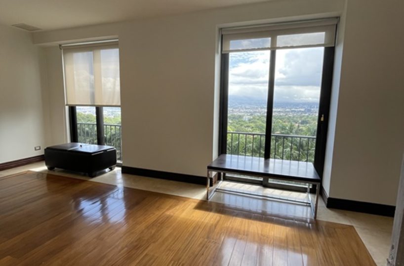 The apartment is located on a fourth level of the building, where residents may access through a key-operated elevator for more privacy. Before entering the apartment is located a powder room, independent from the social area. An ample salon for the living and dining room is located at the entrance which is divided by a decorative wall. The two living rooms in this area have panoramic views of the city and the far mountains of Heredia. In one of the living rooms is a barroom and an office. Finishes throughout the unit include hardwood and marble floors, porcelain veneers, laminate floors, wooden doors, skirting boards, and PVC windows frames. Next to the dining room is a private and spacious kitchen, of course a view of the forests! The kitchen is connected also to the laundry room, maid’s quarter with bathroom, and an emergency exit. Divided by doors, next to the dining area is located a TV room-also with doors that open wide open toward a city and forest views. From the TV room on one side is the master bedroom with a walk-in closet and a private bathroom with a double sink and marble countertops. On the opposite side are located two secondary bedrooms, each with an in suite bathroom, walk-in closet, and view to a natural protected area! All the unit has central A/C, two underground parking spaces, two additional in front of the lobby, visitors’ parking area and storage. The complex has CCTV, two elevators, an emergency power plant, and a fire sprinkle system. Separated from the building is located a relaxing pool with a bar area and a terrace-perfect for enjoying the sun or just relax. RENT: $5.500 + I.V.A. / SALE: $1.000.000