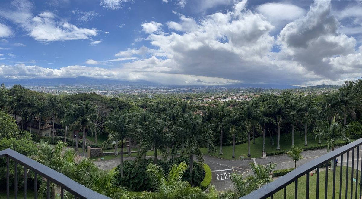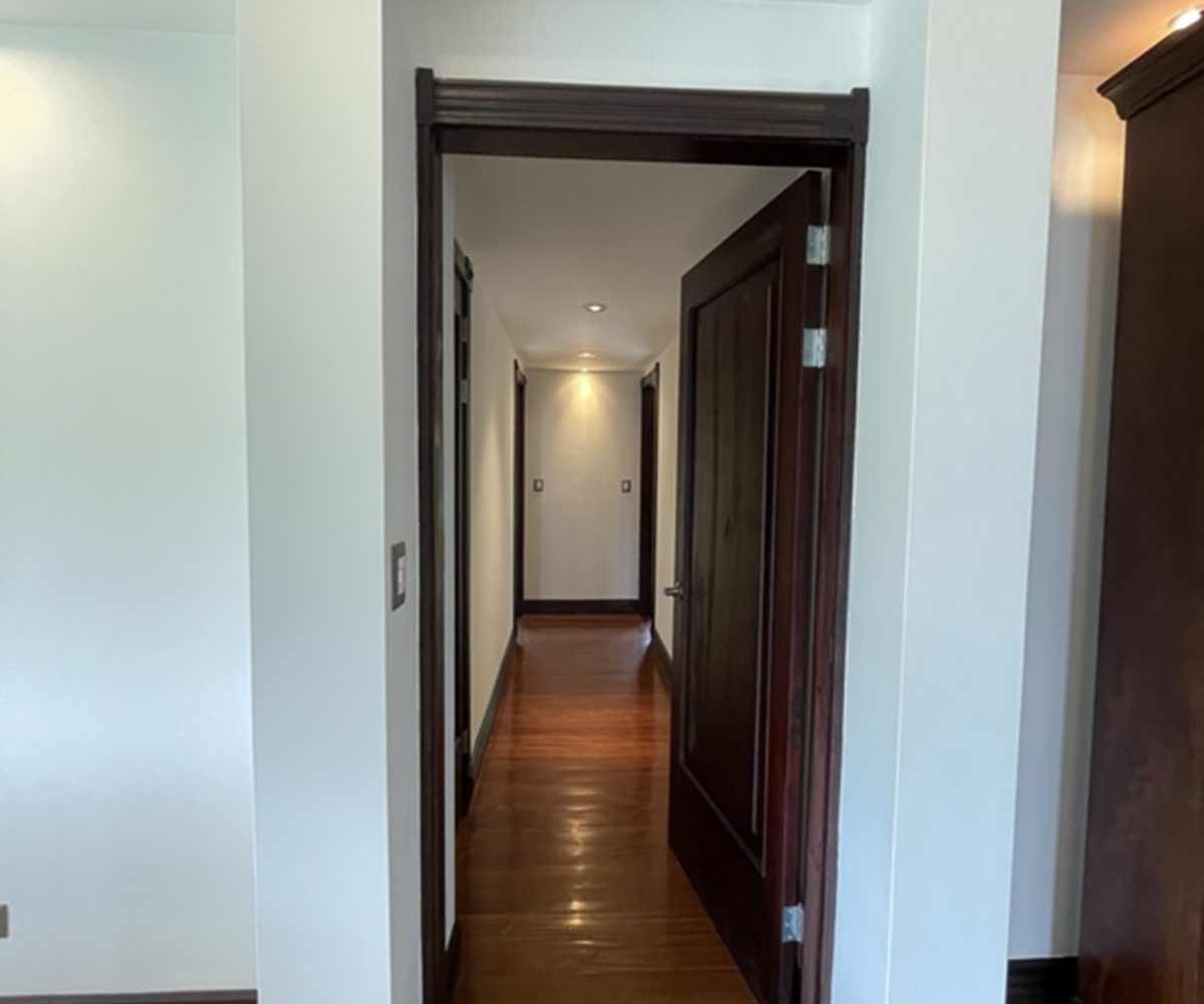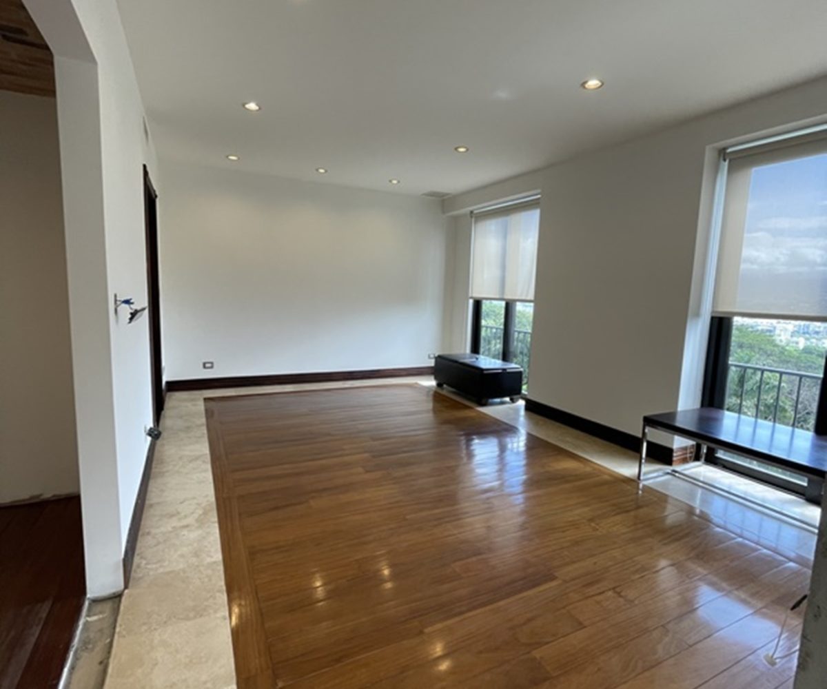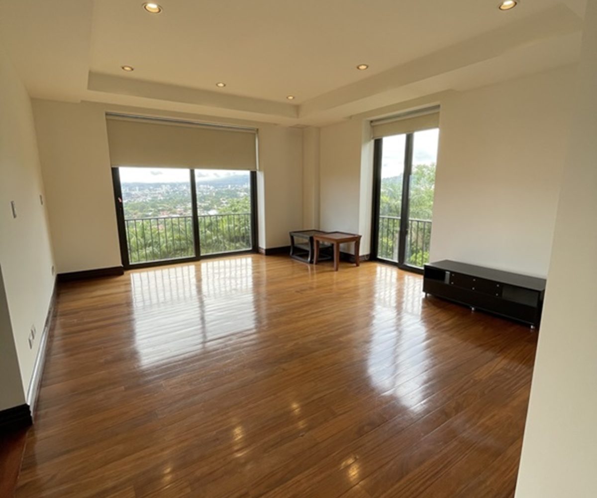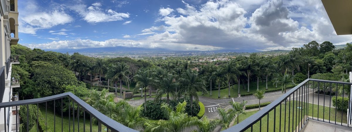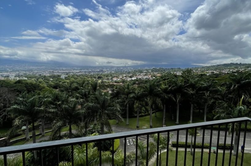The apartment is located on a fourth level of the building, where residents may access through a key-operated elevator for more privacy. Before entering the apartment is located a powder room, independent from the social area. An ample salon for the living and dining room is located at the entrance which is divided by a decorative wall. The two living rooms in this area have panoramic views of the city and the far mountains of Heredia. In one of the living rooms is a barroom and an office. Finishes throughout the unit include hardwood and marble floors, porcelain veneers, laminate floors, wooden doors, skirting boards, and PVC windows frames. Next to the dining room is a private and spacious kitchen, of course a view of the forests! The kitchen is connected also to the laundry room, maid’s quarter with bathroom, and an emergency exit. Divided by doors, next to the dining area is located a TV room-also with doors that open wide open toward a city and forest views. From the TV room on one side is the master bedroom with a walk-in closet and a private bathroom with a double sink and marble countertops. On the opposite side are located two secondary bedrooms, each with an in suite bathroom, walk-in closet, and view to a natural protected area! All the unit has central A/C, two underground parking spaces, two additional in front of the lobby, visitors’ parking area and storage. The complex has CCTV, two elevators, an emergency power plant, and a fire sprinkle system. Separated from the building is located a relaxing pool with a bar area and a terrace-perfect for enjoying the sun or just relax. RENT: $5.500 + I.V.A. / SALE: $1.000.000