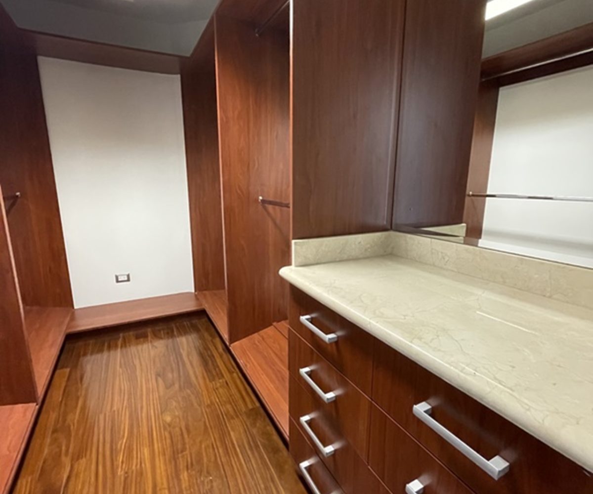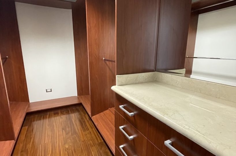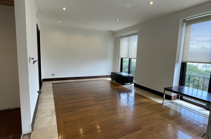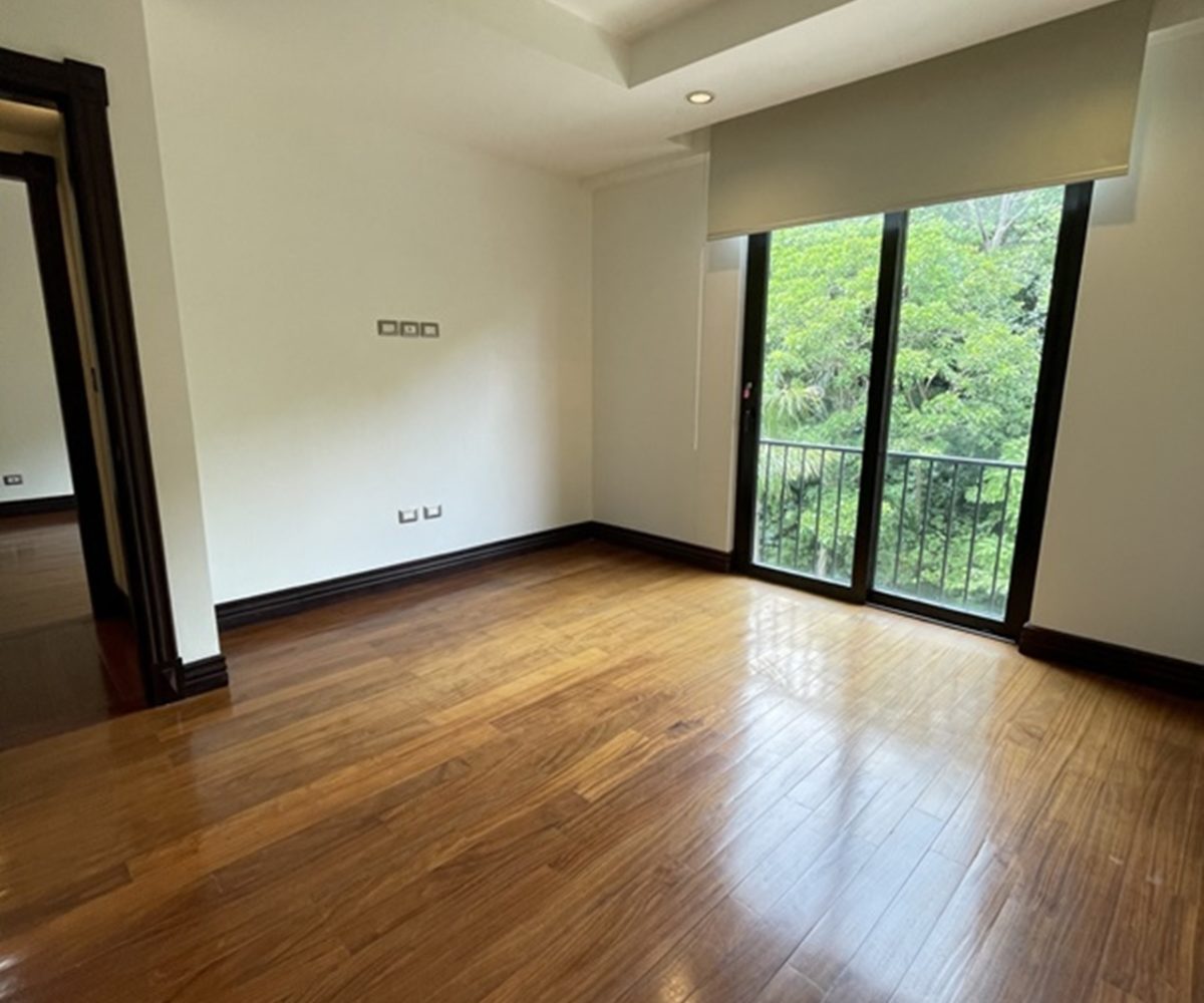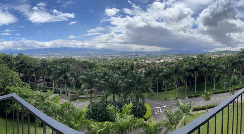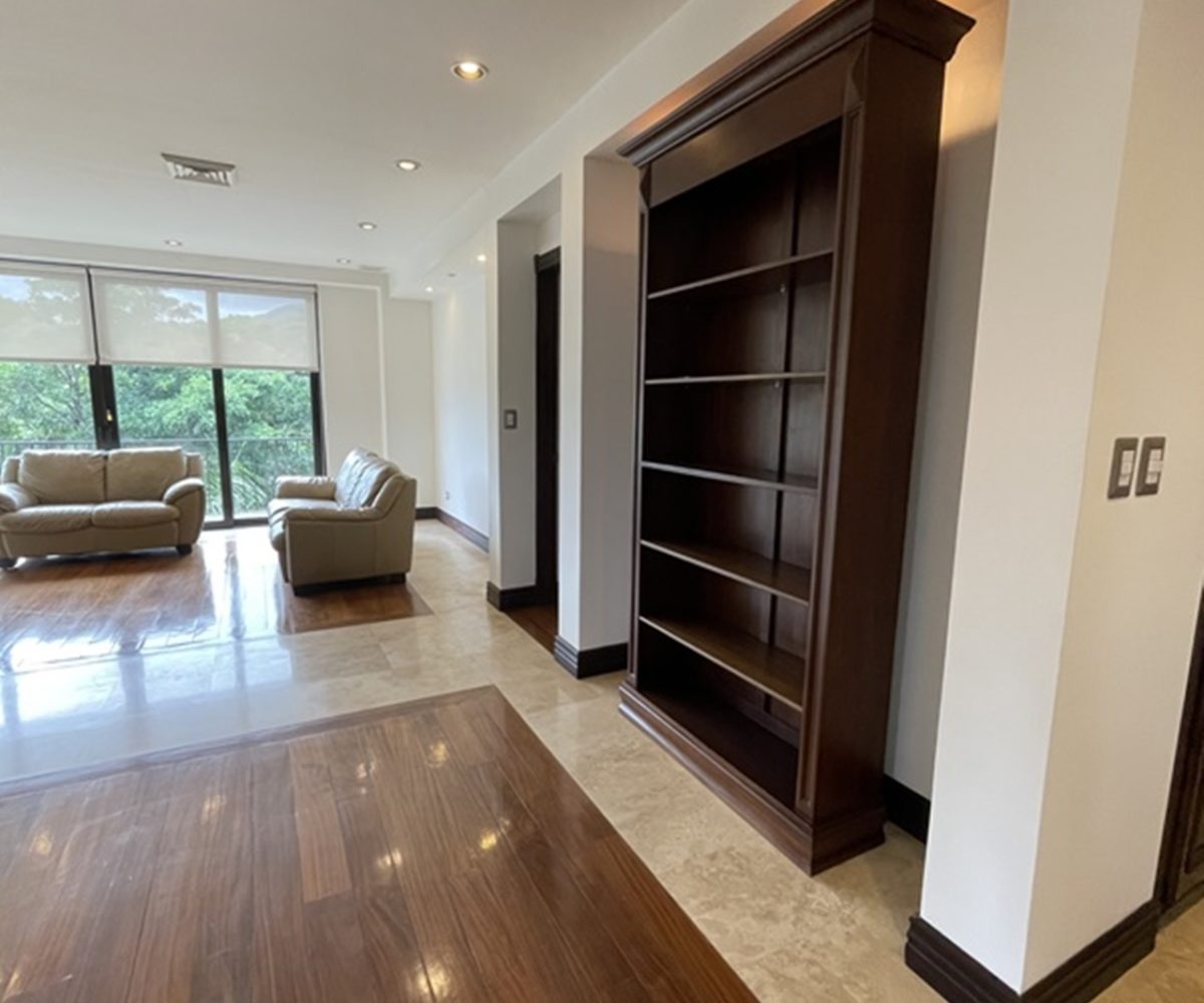 The apartment is located on a fourth level of the building, where residents may access through a key-operated elevator for more privacy. Before entering the apartment is located a powder room, independent from the social area. An ample salon for the living and dining room is located at the entrance which is divided by a decorative wall. The two living rooms in this area have panoramic views of the city and the far mountains of Heredia. In one of the living rooms is a barroom and an office. Finishes throughout the unit include hardwood and marble floors, porcelain veneers, laminate floors, wooden doors, skirting boards, and PVC windows frames. Next to the dining room is a private and spacious kitchen, of course a view of the forests! The kitchen is connected also to the laundry room, maid’s quarter with bathroom, and an emergency exit. Divided by doors, next to the dining area is located a TV room-also with doors that open wide open toward a city and forest views. From the TV room on one side is the master bedroom with a walk-in closet and a private bathroom with a double sink and marble countertops. On the opposite side are located two secondary bedrooms, each with an in suite bathroom, walk-in closet, and view to a natural protected area! All the unit has central A/C, two underground parking spaces, two additional in front of the lobby, visitors’ parking area and storage. The complex has CCTV, two elevators, an emergency power plant, and a fire sprinkle system. Separated from the building is located a relaxing pool with a bar area and a terrace-perfect for enjoying the sun or just relax. RENT: $5.500 + I.V.A. / SALE: $1.000.000