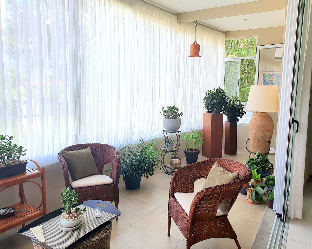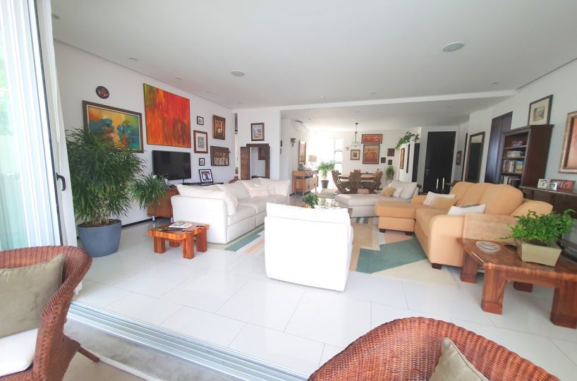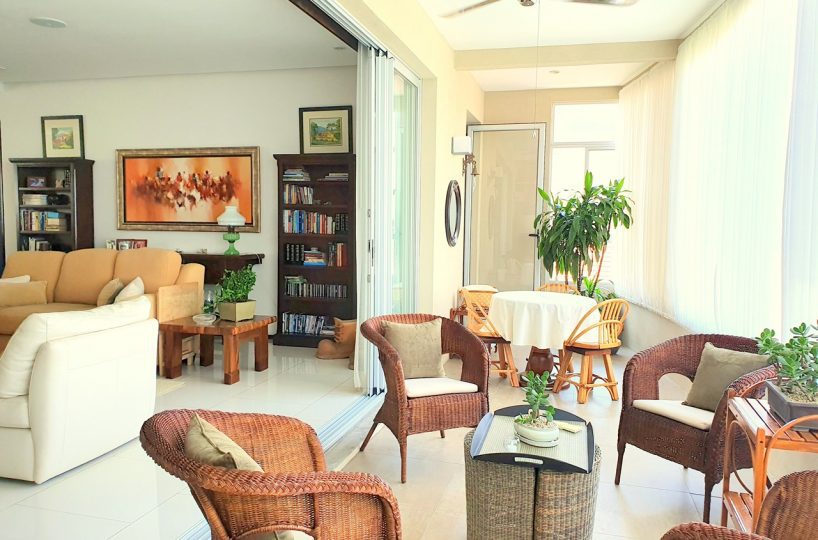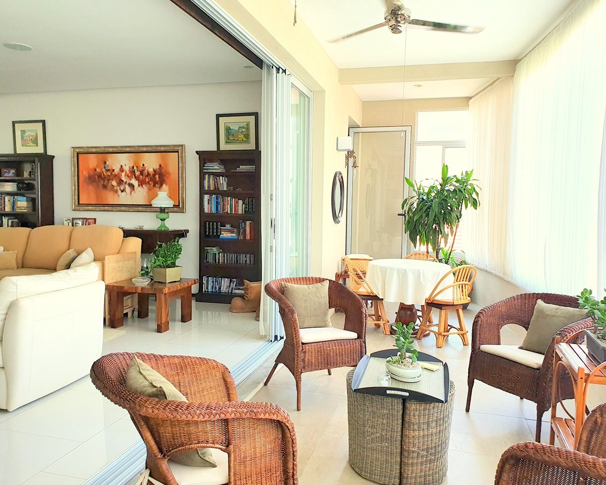 A large dining room, family room with glass windows, closed terrace with large sliding windows and a beautiful view.
