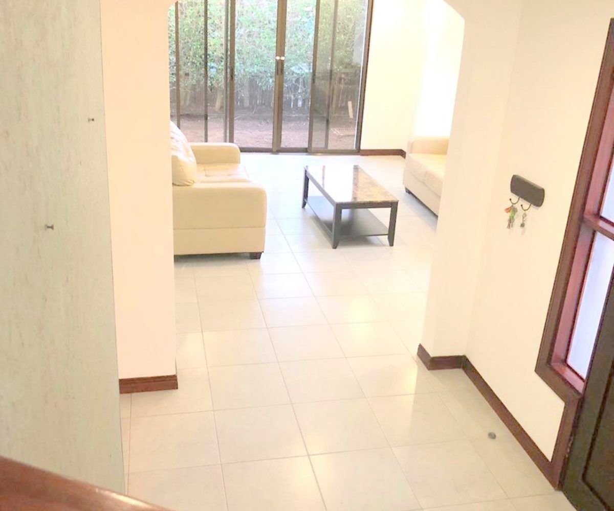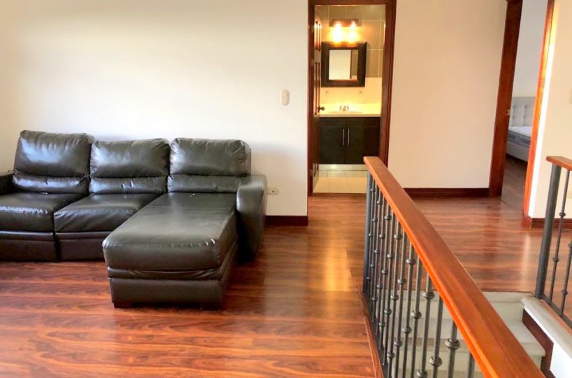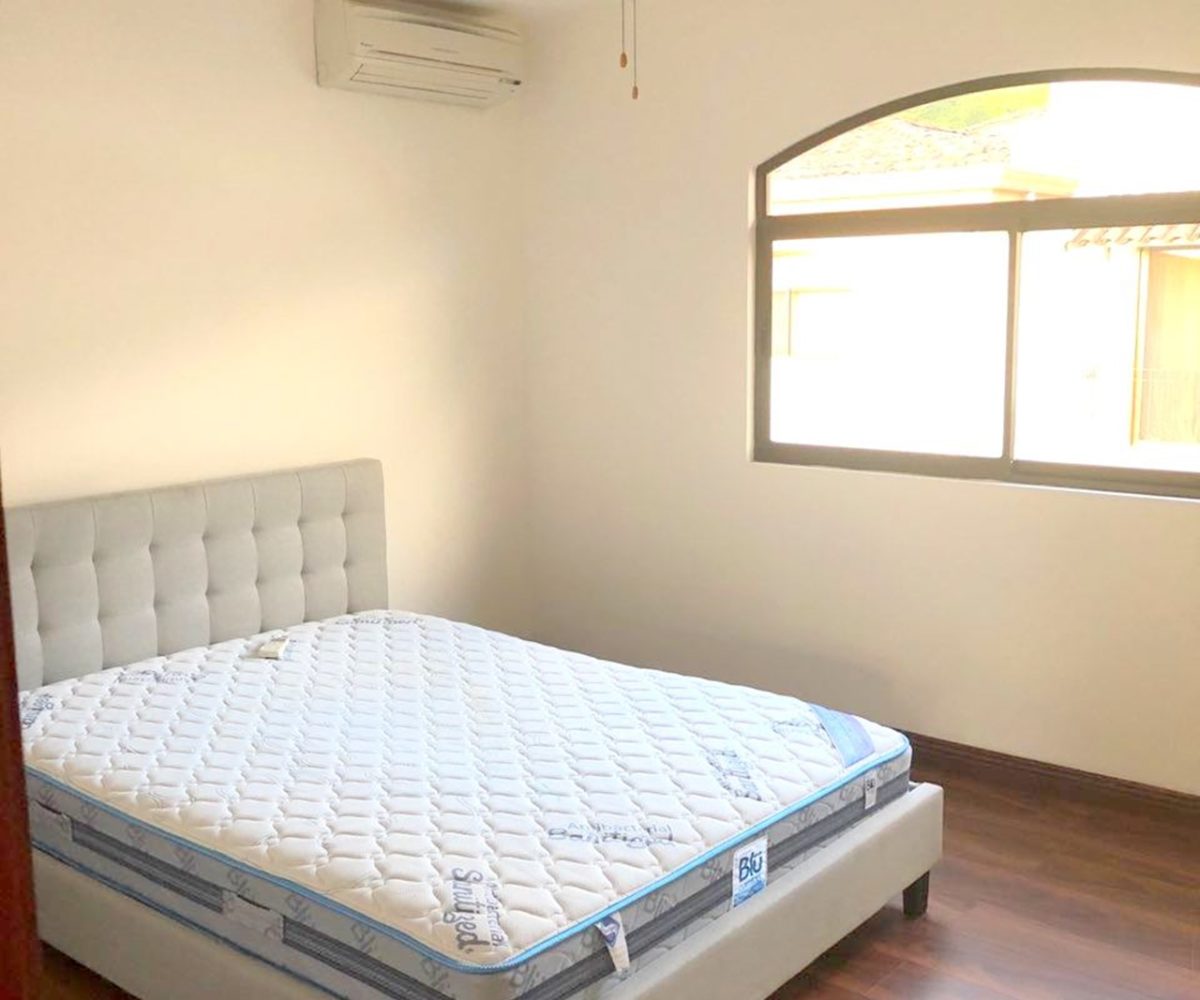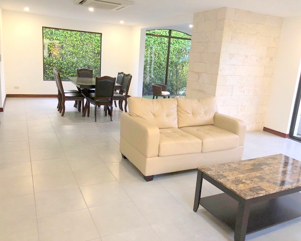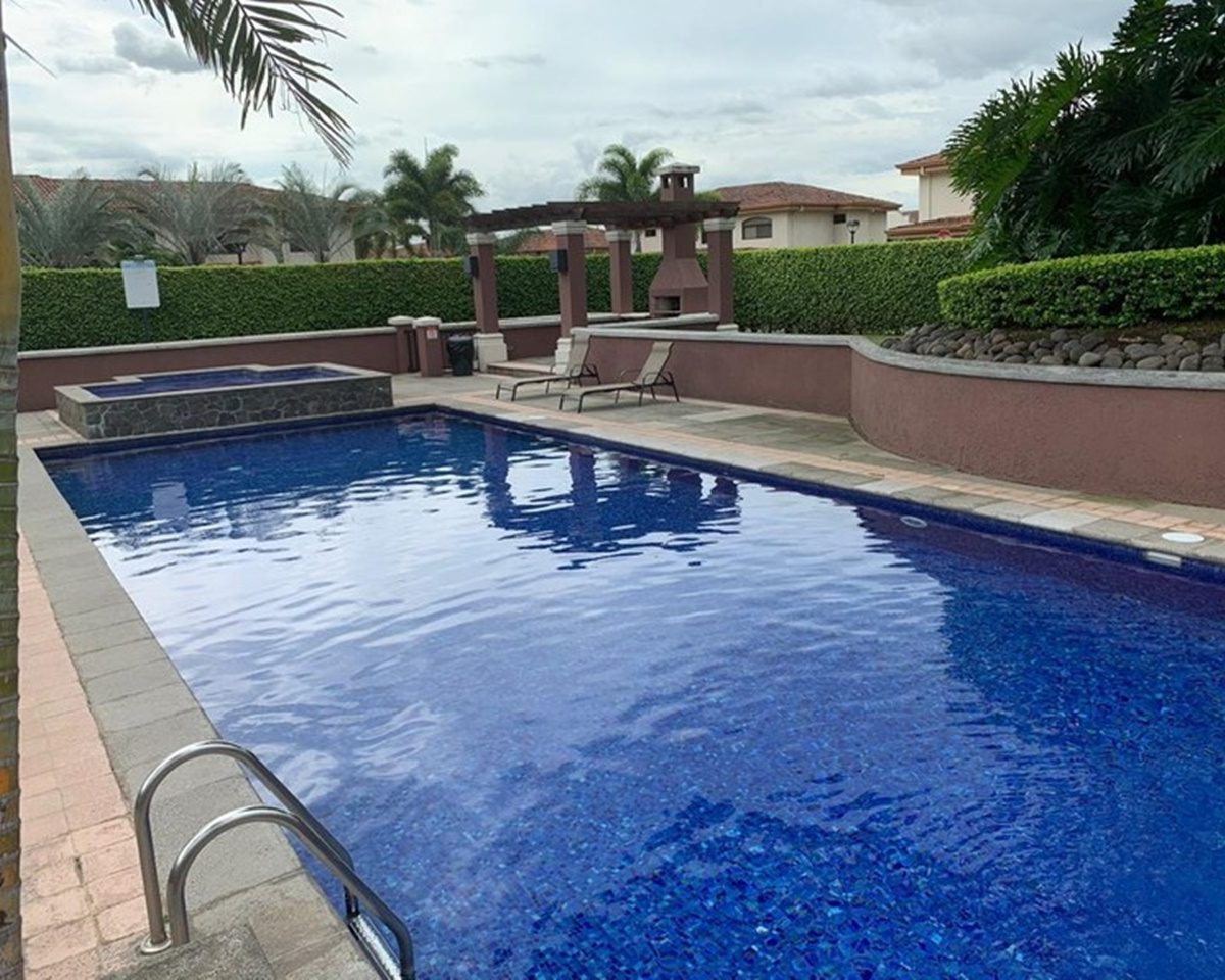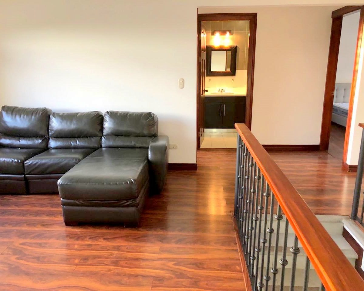 Elegant and spacious house in condominium located in Pozos, Santa Ana, close to all amenities and services. Lot of 290 m2 and construction of 275 m2, distributed in two floors. In the first level: Garage for 2 cars and cellar, maid´s quarters, laundry area and internal cellar, kitchen with island and pantry, large living and dining room, covered terrace with bar area, 1/2 bathroom for visitors, patio. On the second level: Master bedroom with walk-in closet and bathroom with shower and tub, 2 secondary bedrooms with full bathroom each, play area or office and TV room. The house also has a water collection tank, surge voltage suppressor to protect the appliances, air conditioning in rooms and living room, fans in rooms and room T.V. second level. The complex has a clubhouse, playground, 3 swimming pools, jacuzzi, and tennis court. FURNISHED RENT: $ 2.900