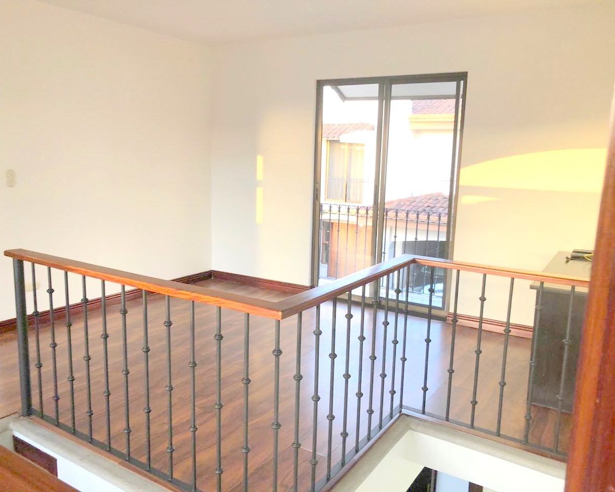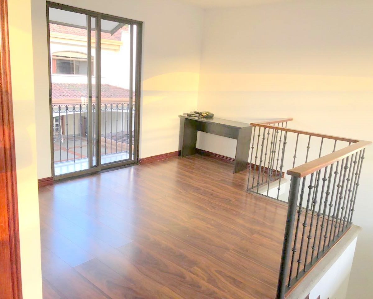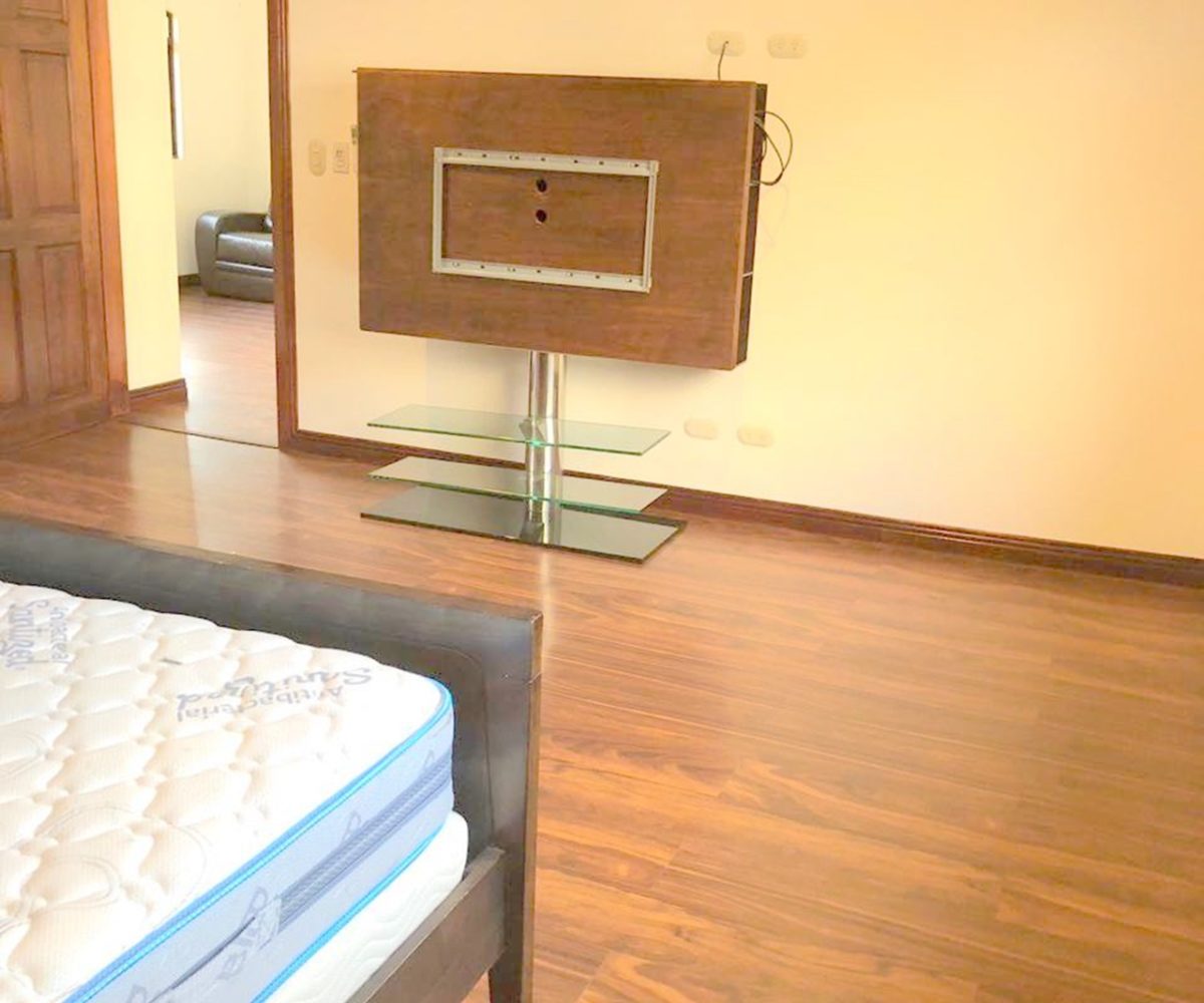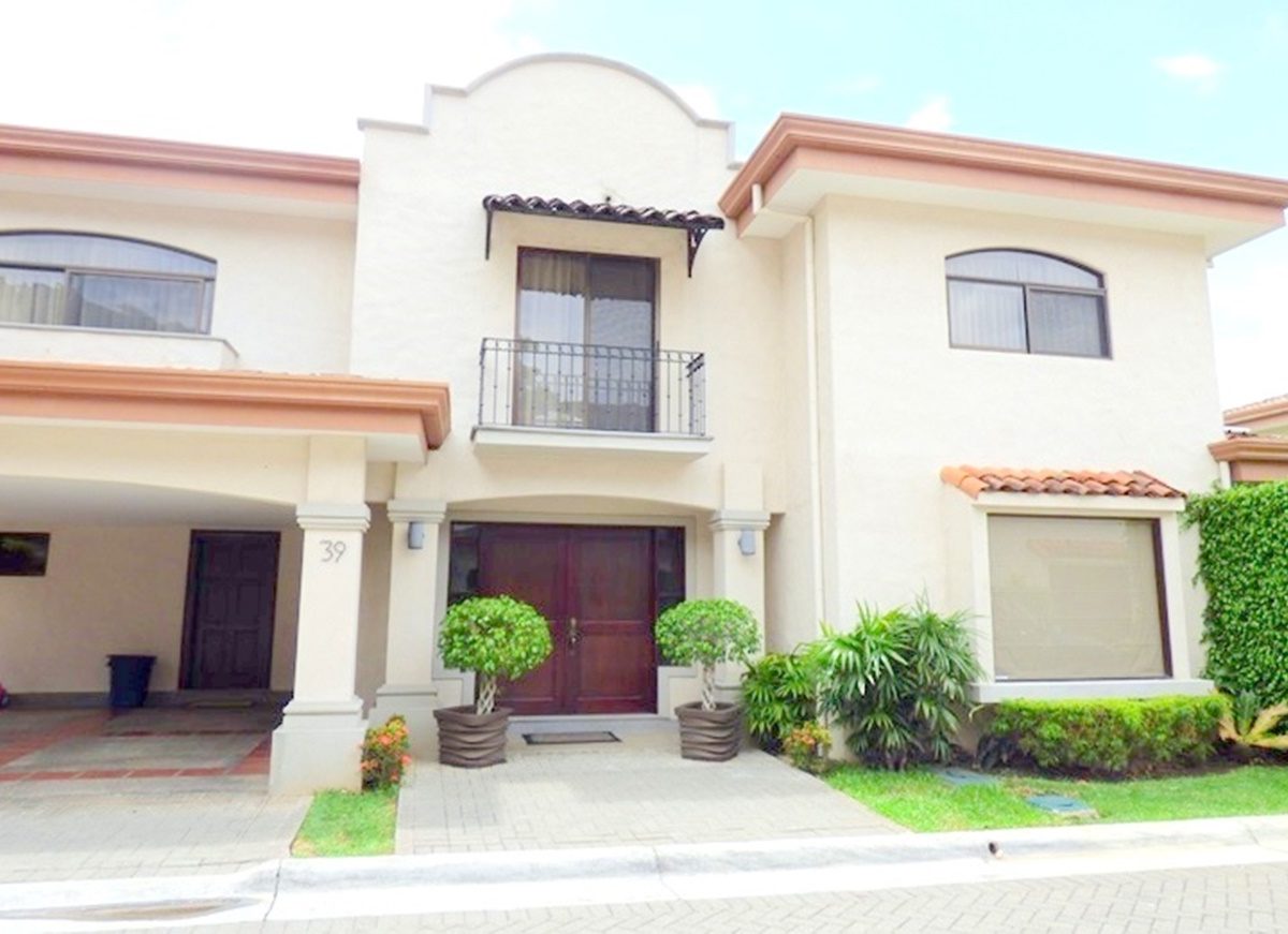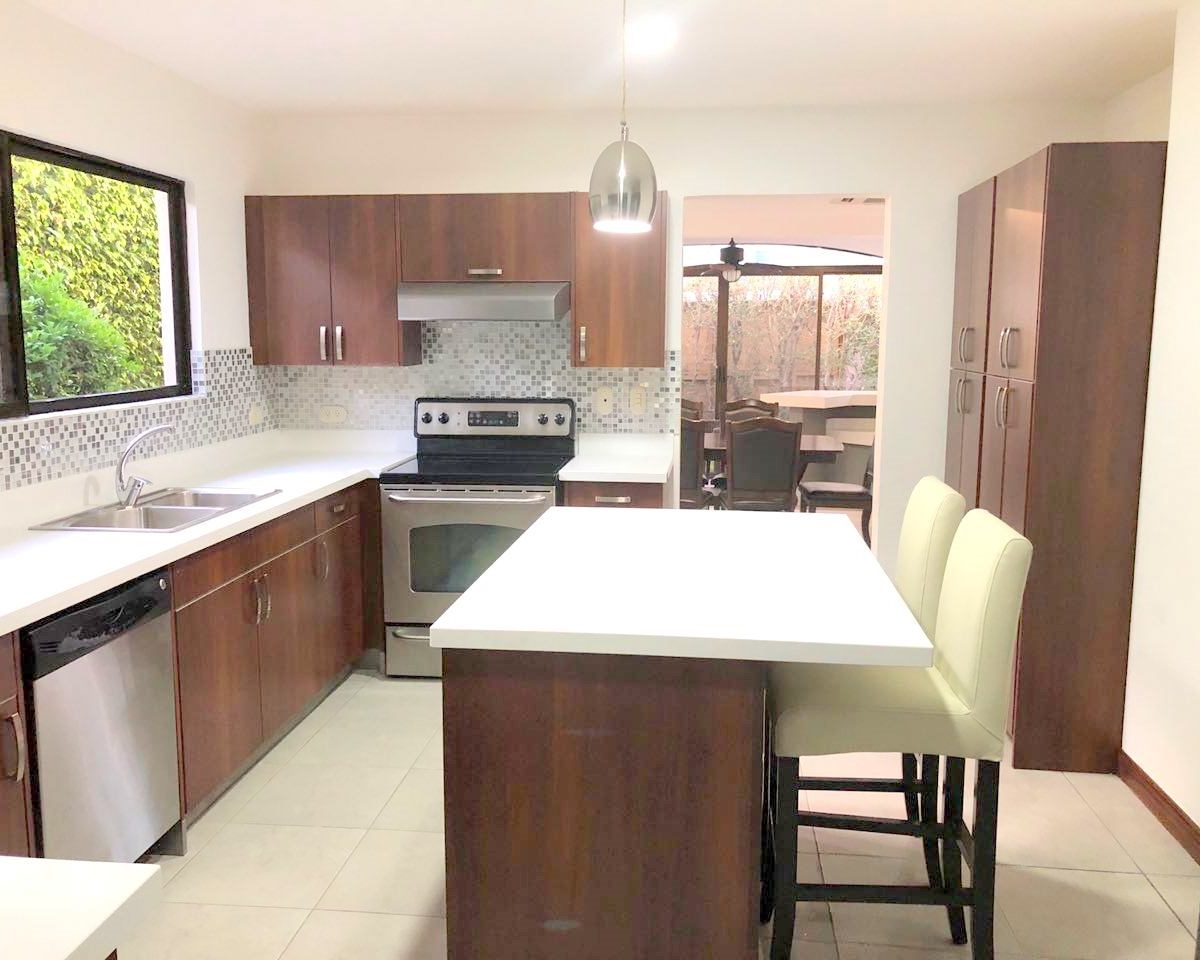 Elegant and spacious house in condominium located in Pozos, Santa Ana, close to all amenities and services. Lot of 290 m2 and construction of 275 m2, distributed in two floors. In the first level: Garage for 2 cars and cellar, maid´s quarters, laundry area and internal cellar, kitchen with island and pantry, large living and dining room, covered terrace with bar area, 1/2 bathroom for visitors, patio. On the second level: Master bedroom with walk-in closet and bathroom with shower and tub, 2 secondary bedrooms with full bathroom each, play area or office and TV room. The house also has a water collection tank, surge voltage suppressor to protect the appliances, air conditioning in rooms and living room, fans in rooms and room T.V. second level. The complex has a clubhouse, playground, 3 swimming pools, jacuzzi, and tennis court. FURNISHED RENT: $ 2.900