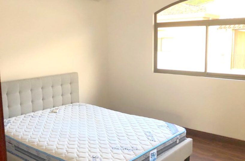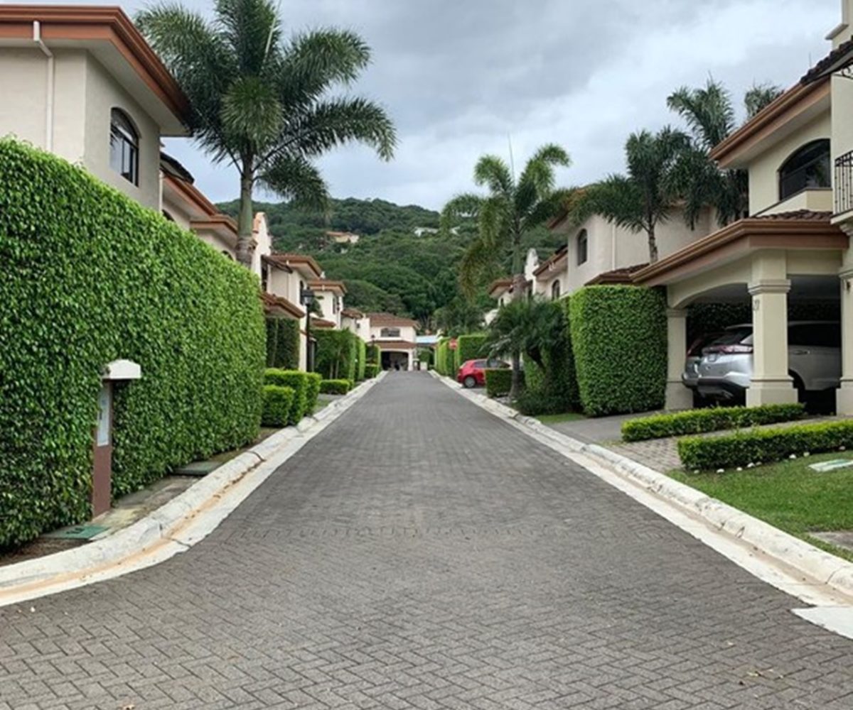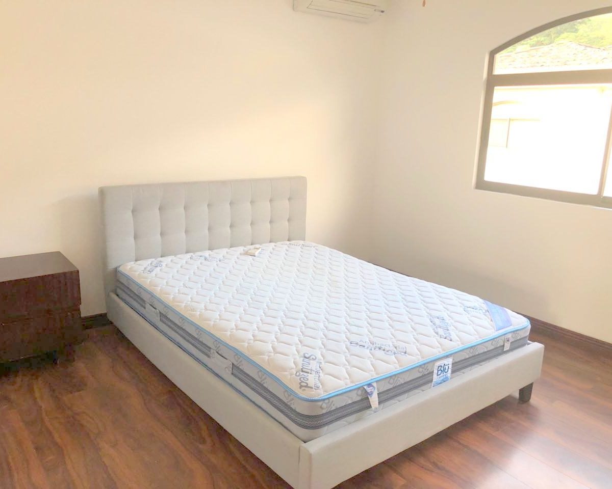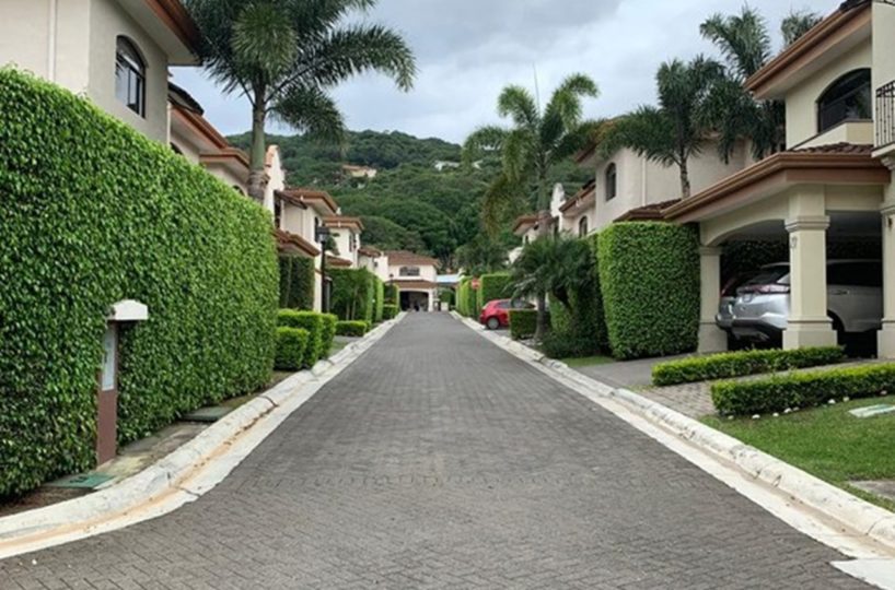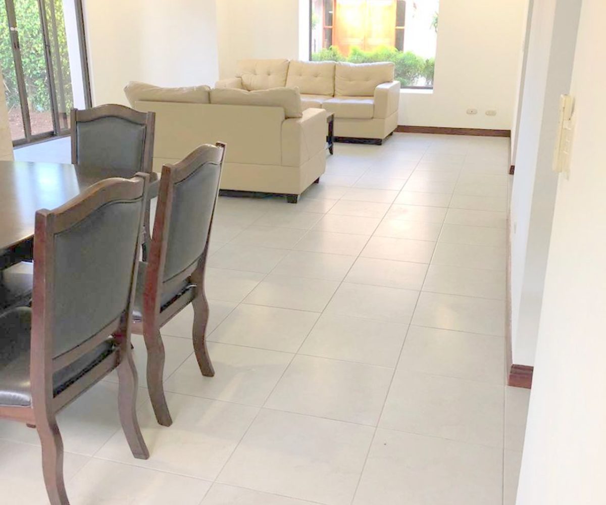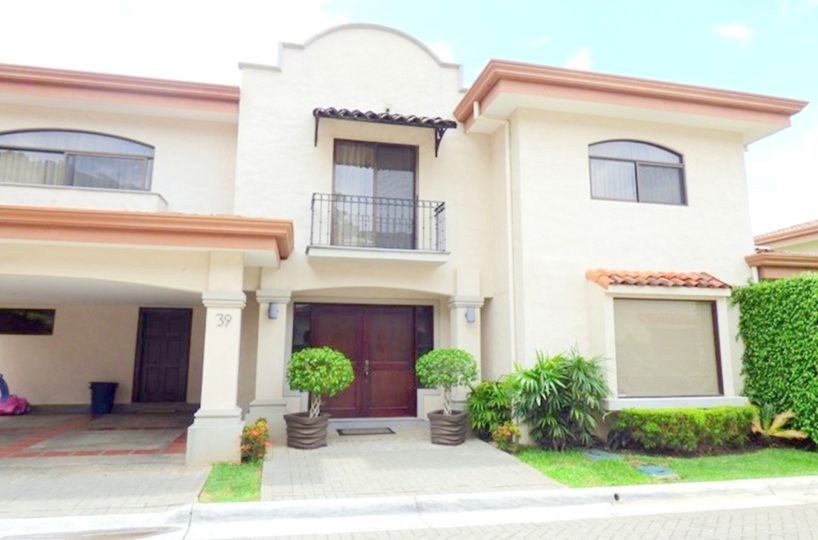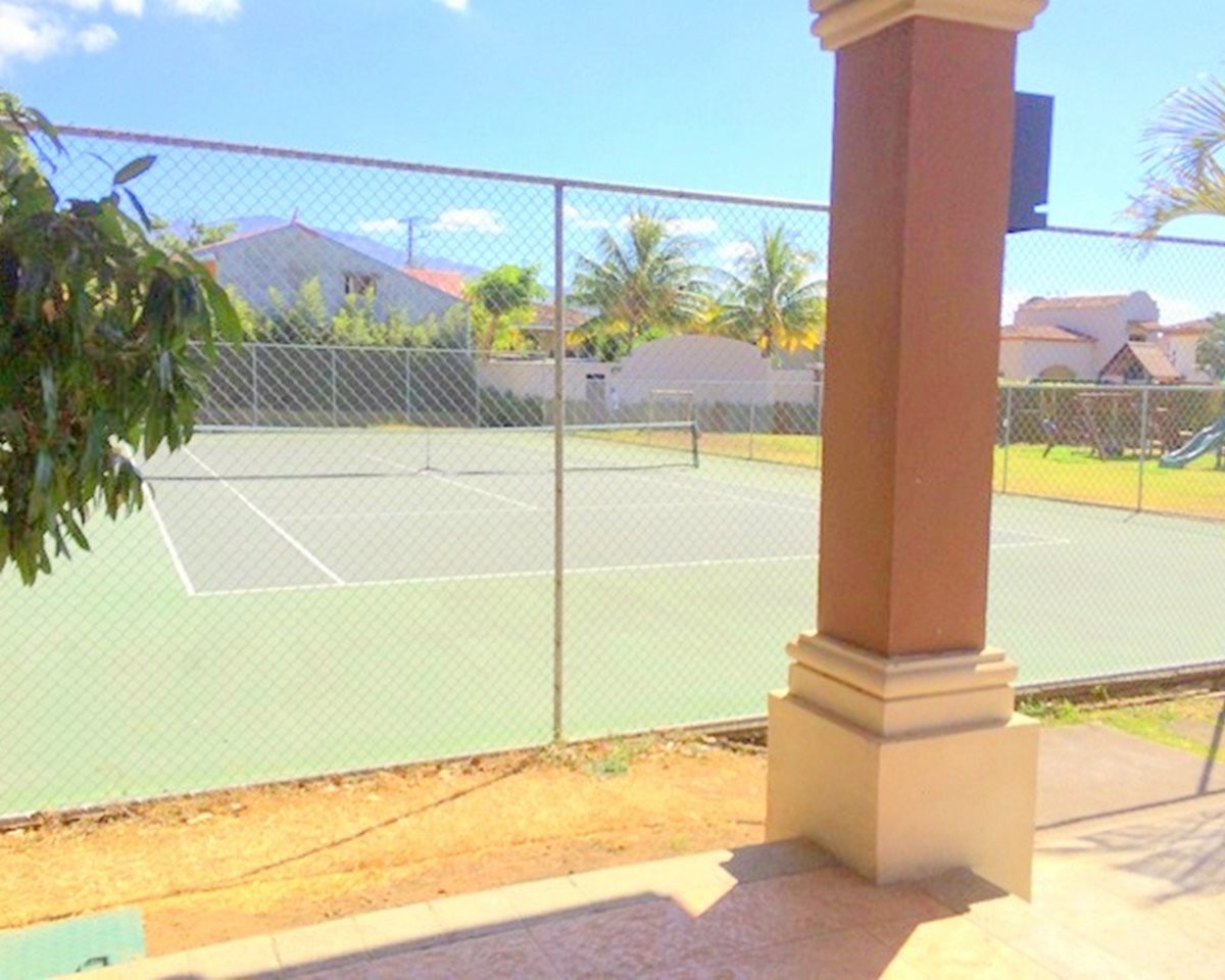 Elegant and spacious house in condominium located in Pozos, Santa Ana, close to all amenities and services. Lot of 290 m2 and construction of 275 m2, distributed in two floors. In the first level: Garage for 2 cars and cellar, maid´s quarters, laundry area and internal cellar, kitchen with island and pantry, large living and dining room, covered terrace with bar area, 1/2 bathroom for visitors, patio. On the second level: Master bedroom with walk-in closet and bathroom with shower and tub, 2 secondary bedrooms with full bathroom each, play area or office and TV room. The house also has a water collection tank, surge voltage suppressor to protect the appliances, air conditioning in rooms and living room, fans in rooms and room T.V. second level. The complex has a clubhouse, playground, 3 swimming pools, jacuzzi, and tennis court. FURNISHED RENT: $ 2.900