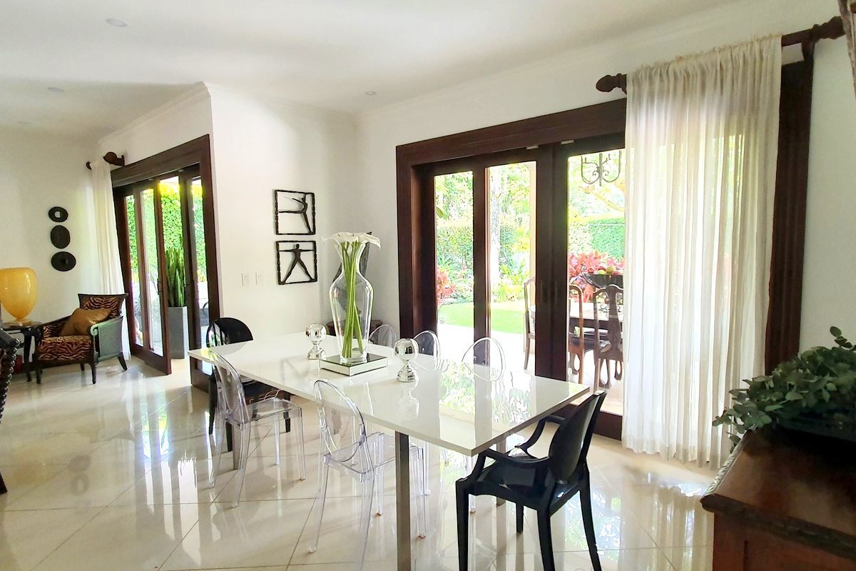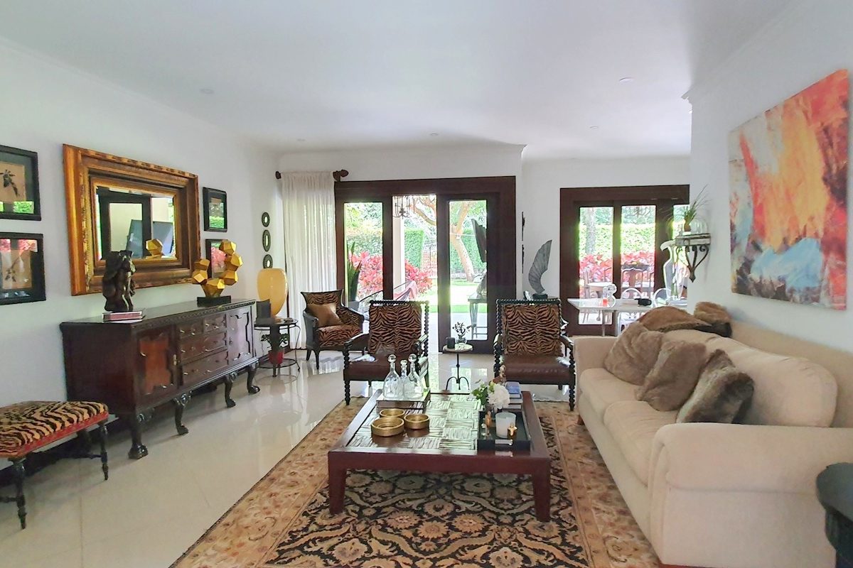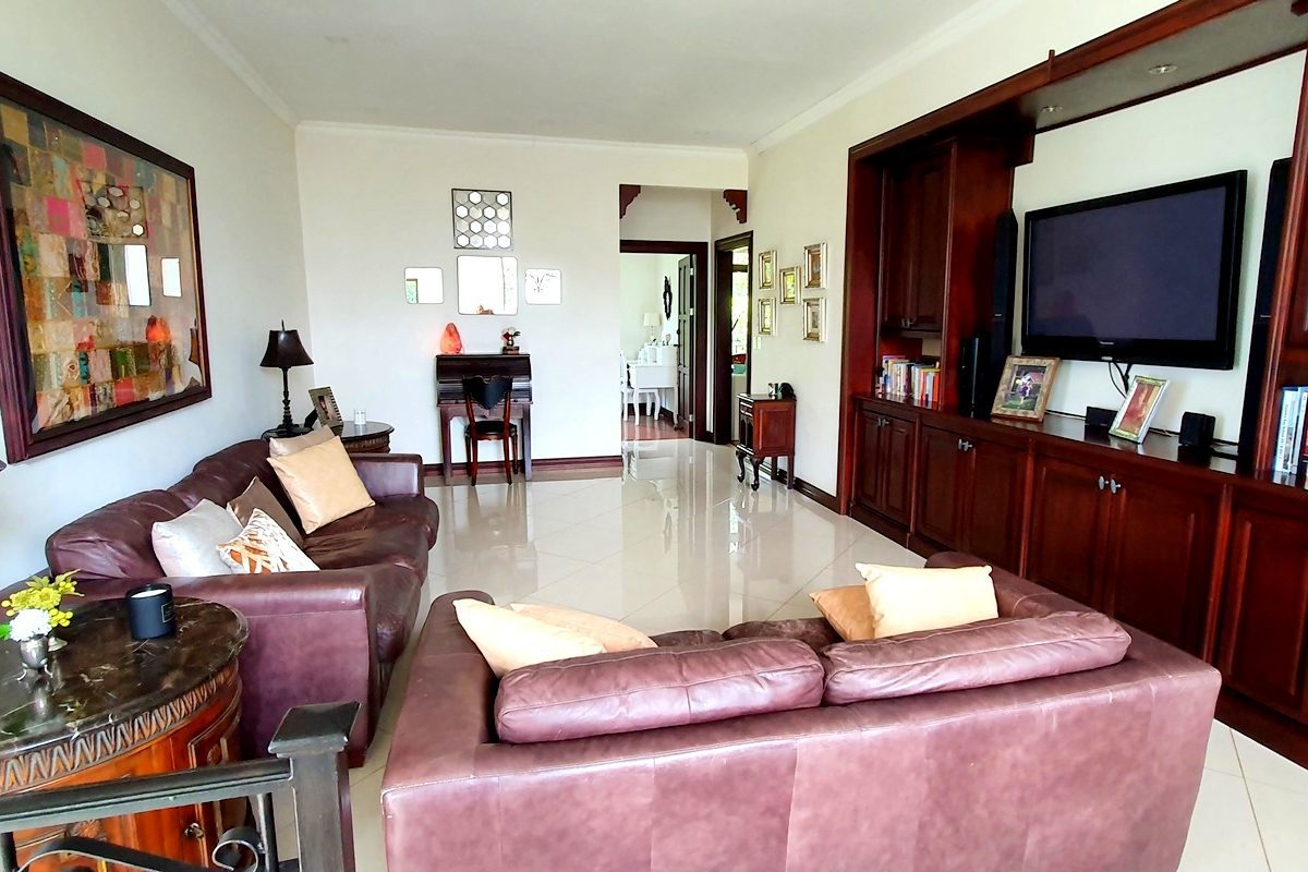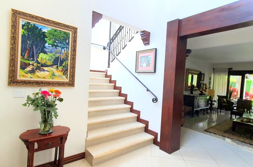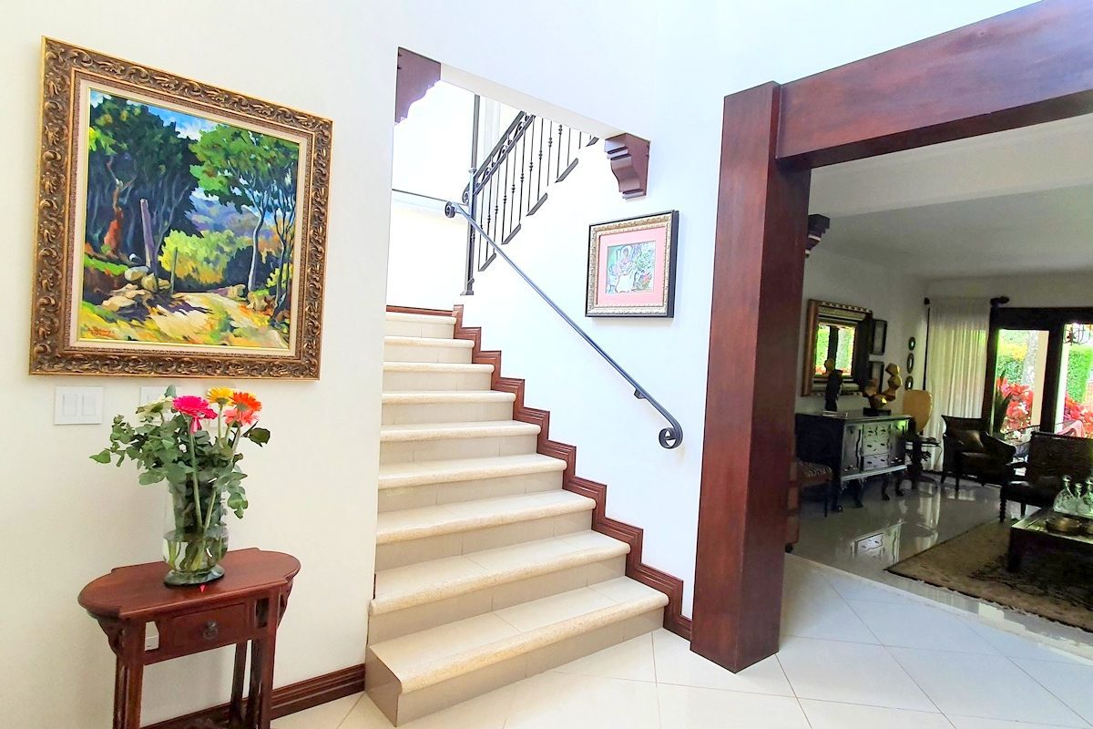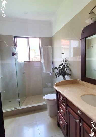 2 story house with 4 bedrooms. Master and 1 more with its private bath. Other 2 share a bath. Bath for visitors. Is a gorgeus social area … living, dinning, terrace. Huge garden with trees and pretty flowers and plants.