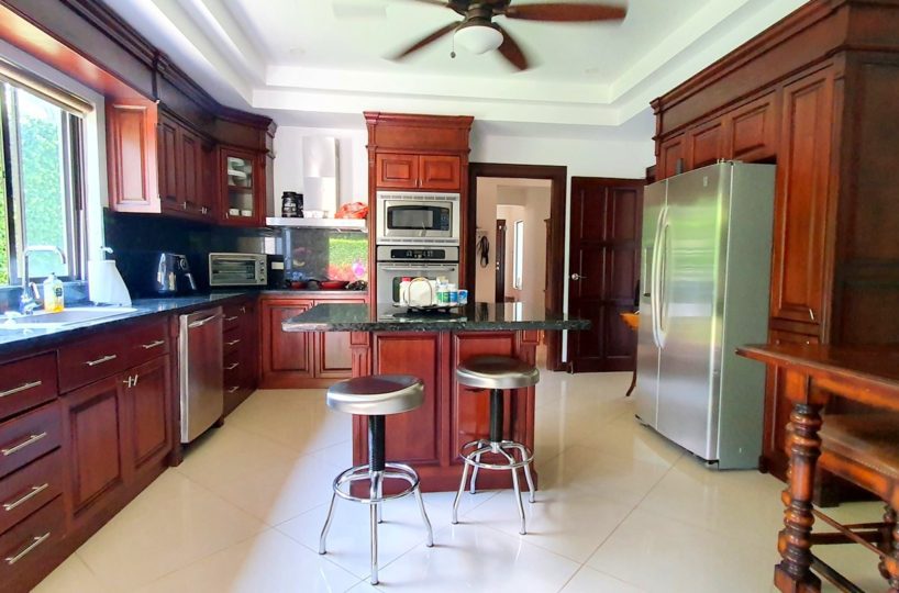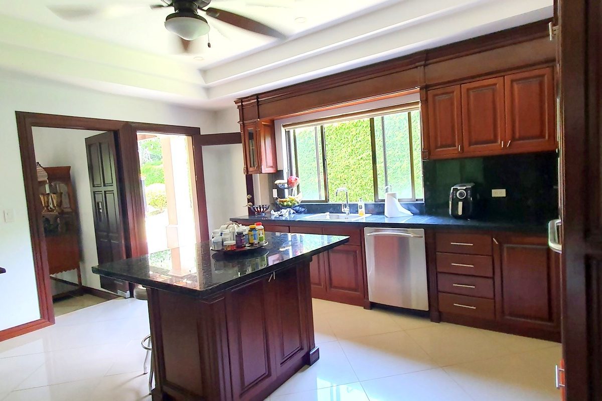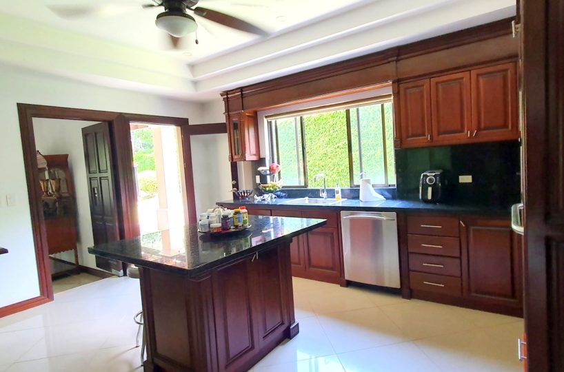 Spacious kitchen with granite countertops and wooden cabinets. Pantry and Island. The terrace facing the spectacular garden is a special experience. Great view!