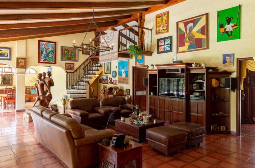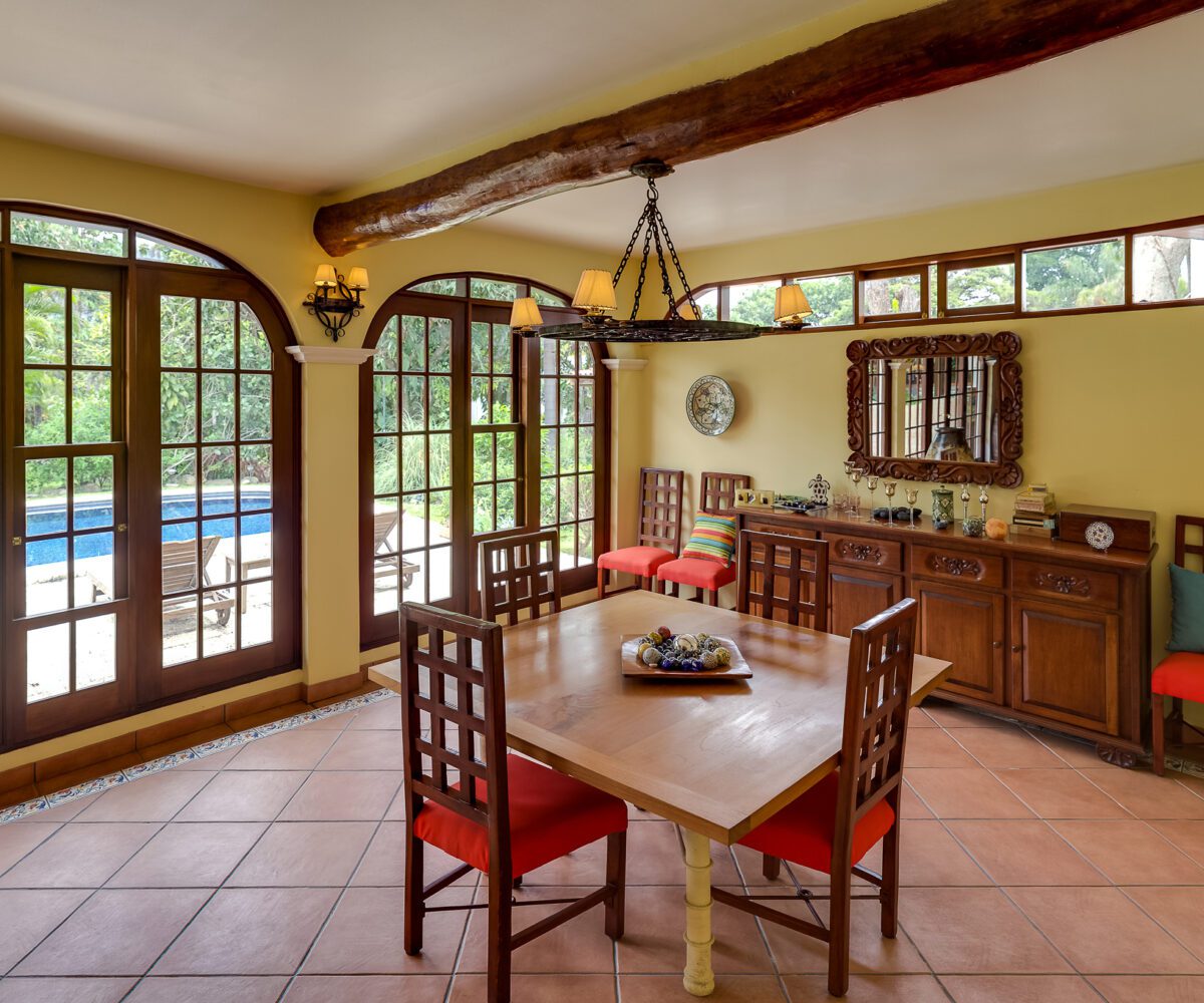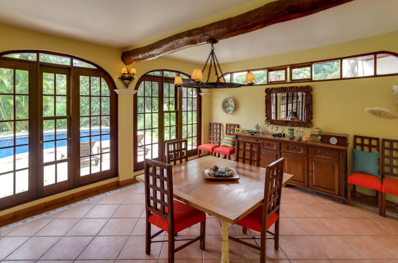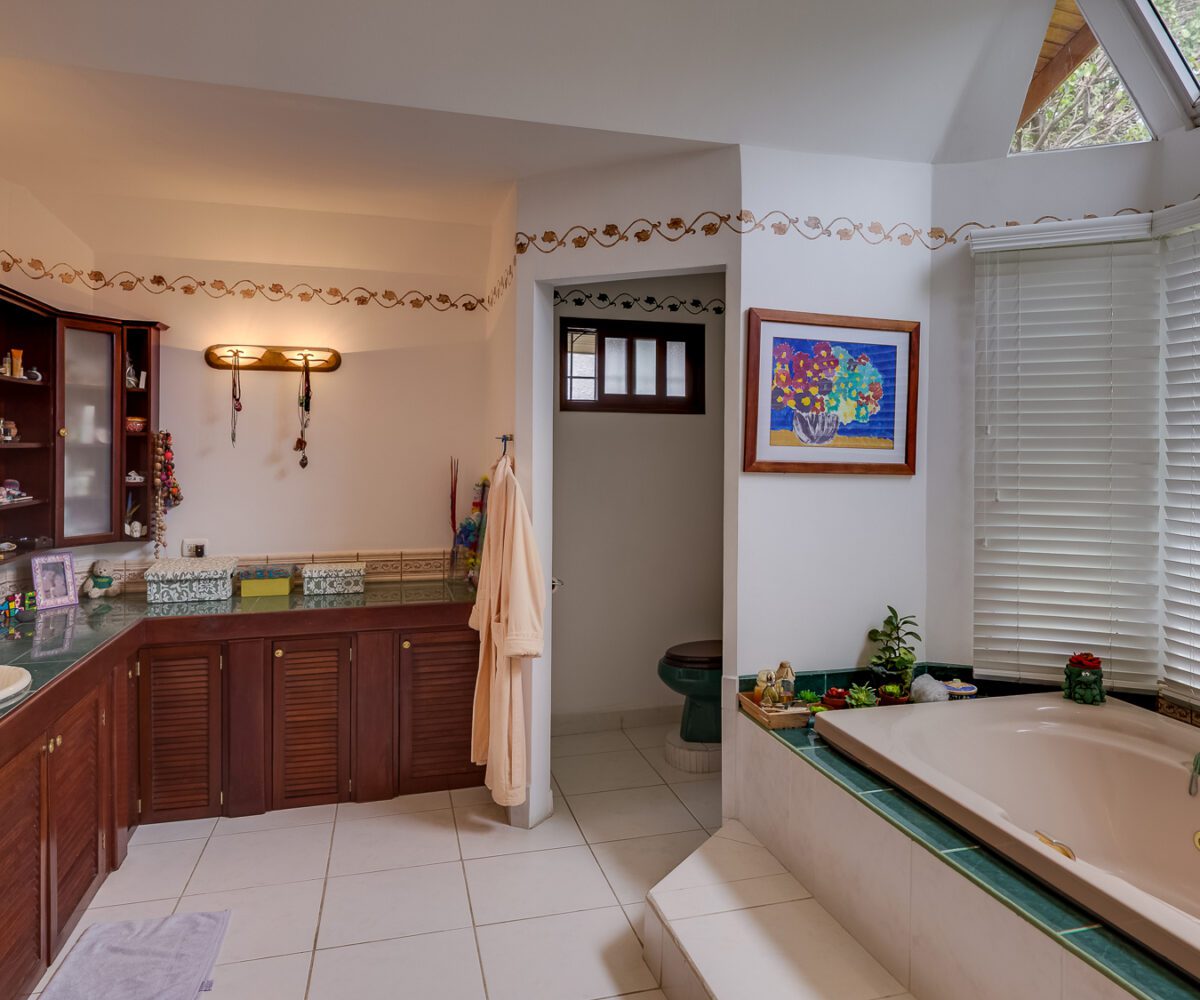 MAIN HOUSE: – The lobby offers quick access to the kitchen on the right, the private area and bedroom on the left, and immediate access to the Living Room and Dining Room, with spectacular views of the terrace, pool and green areas. – The Living room has beautiful ceramic floors and double height ceilings that provide natural light and ventilation. Its French doors open to the spacious terrace, and to the pool. The living room also has a useful mezzanine. – The dining room is spacious and bright and also opens onto the terrace and pool area.
