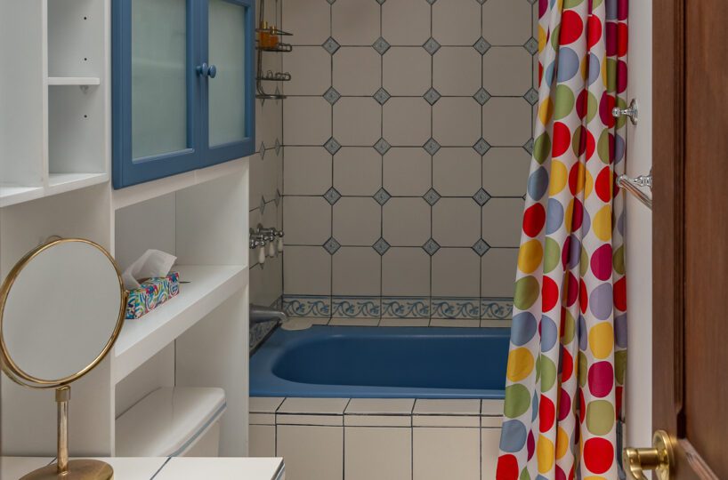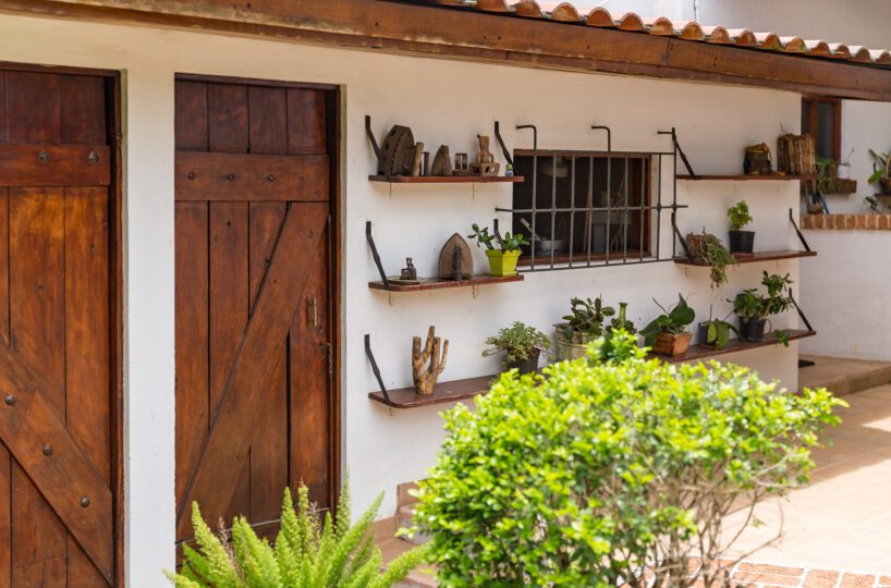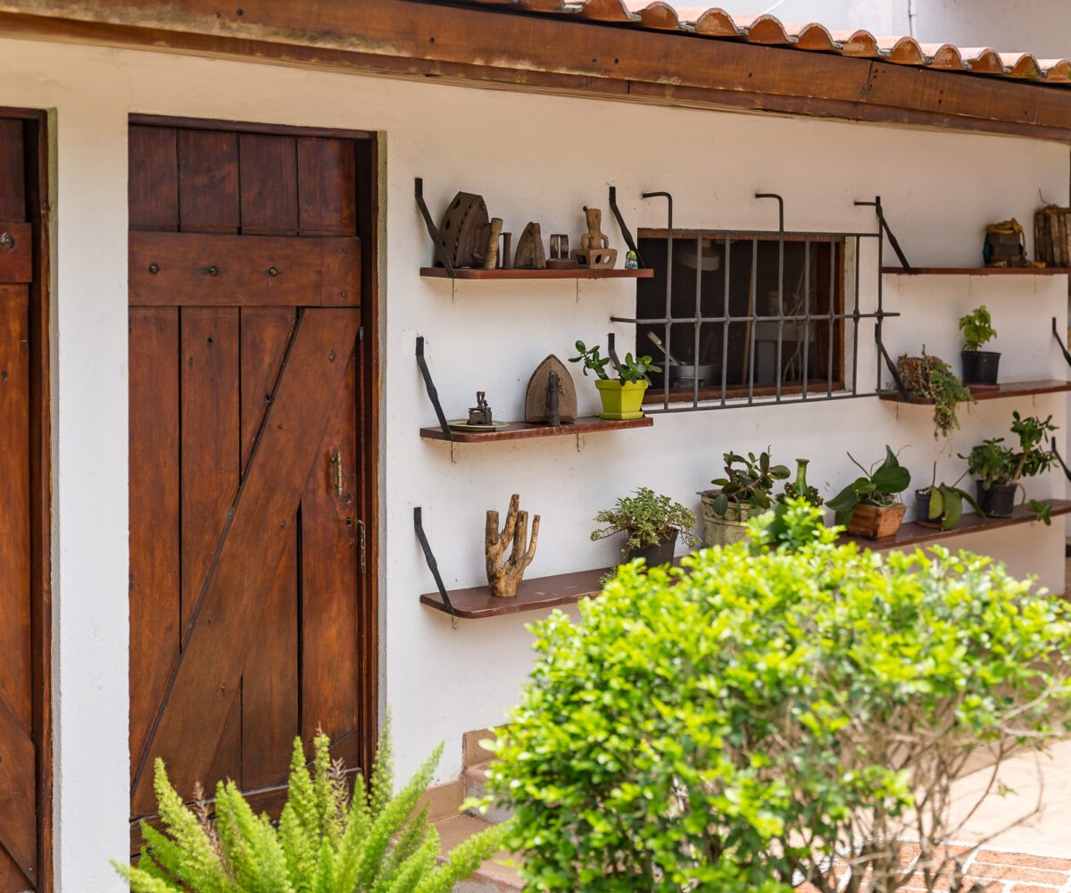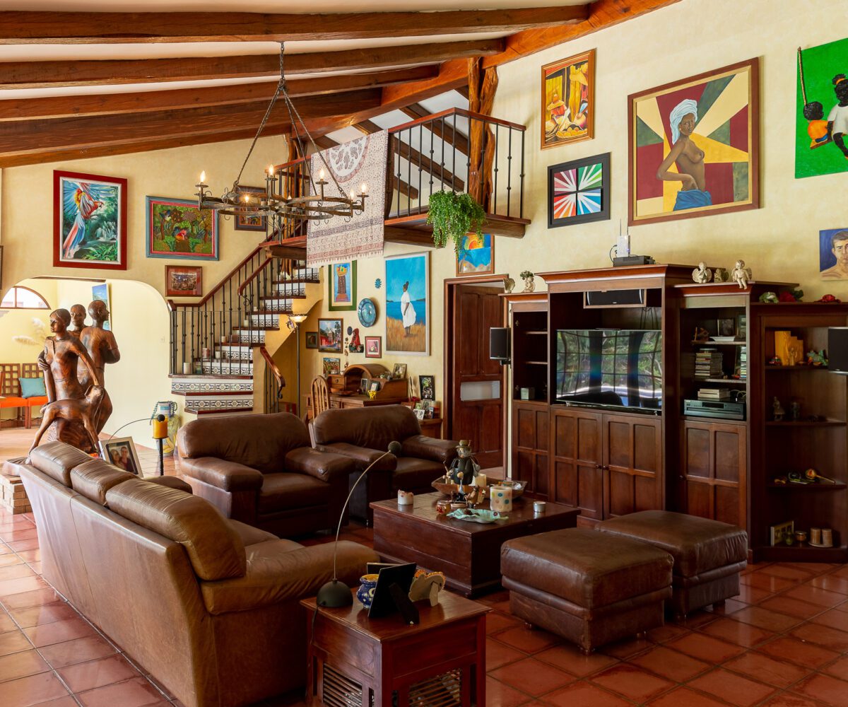 MAIN HOUSE: – The lobby offers quick access to the kitchen on the right, the private area and bedroom on the left, and immediate access to the Living Room and Dining Room, with spectacular views of the terrace, pool and green areas. – The Living room has beautiful ceramic floors and double height ceilings that provide natural light and ventilation. Its French doors open to the spacious terrace, and to the pool. The living room also has a useful mezzanine. – The dining room is spacious and bright and also opens onto the terrace and pool area.