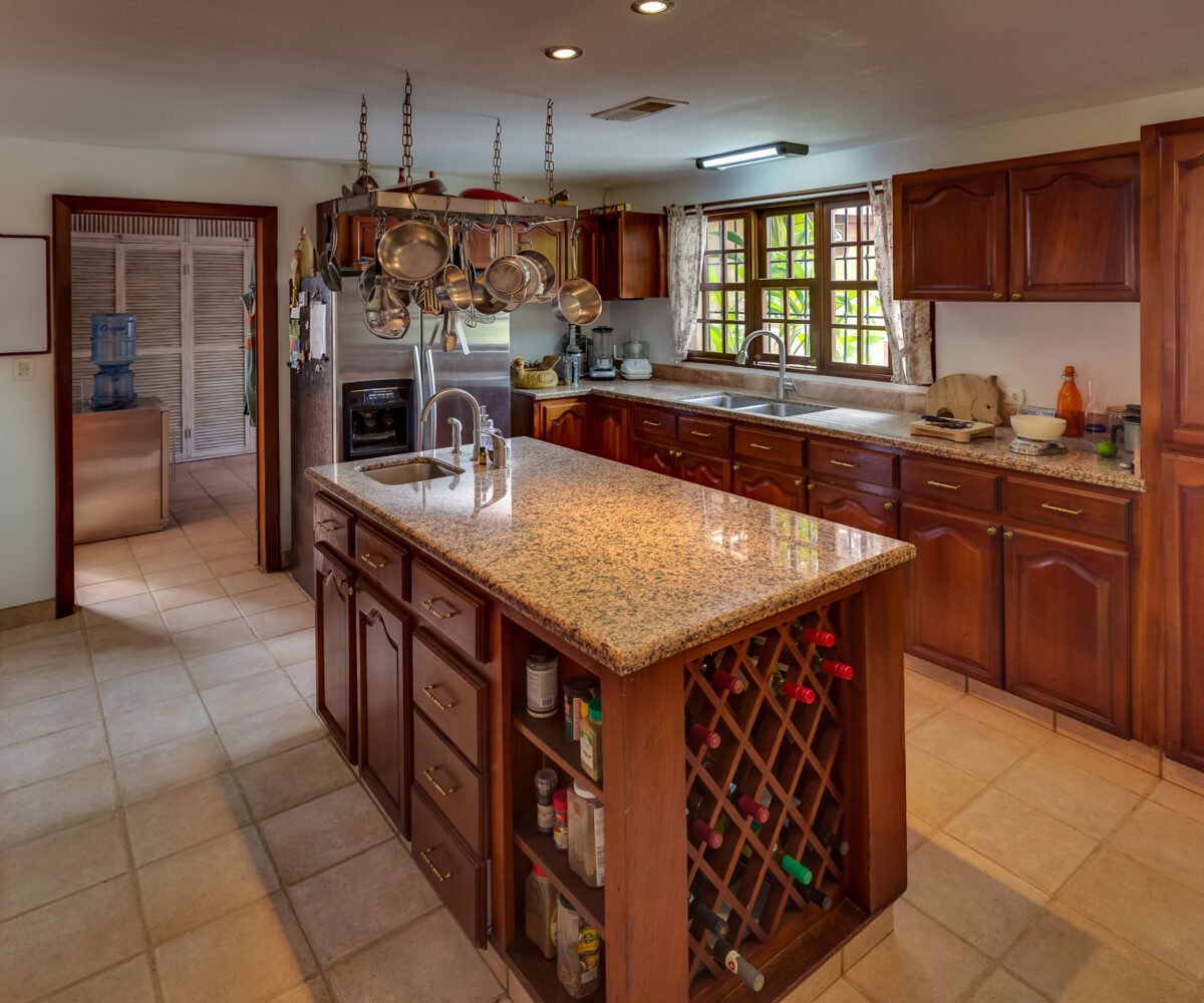 – The beautiful Pool that has a large sundeck and the Terrace are ideal spaces for socializing. It also has a dressing room and guest bathroom. – In the right wing is the spacious kitchen with granite countertops and fine wood cabinets. Next to it is the laundry room and the service room with its bathroom.